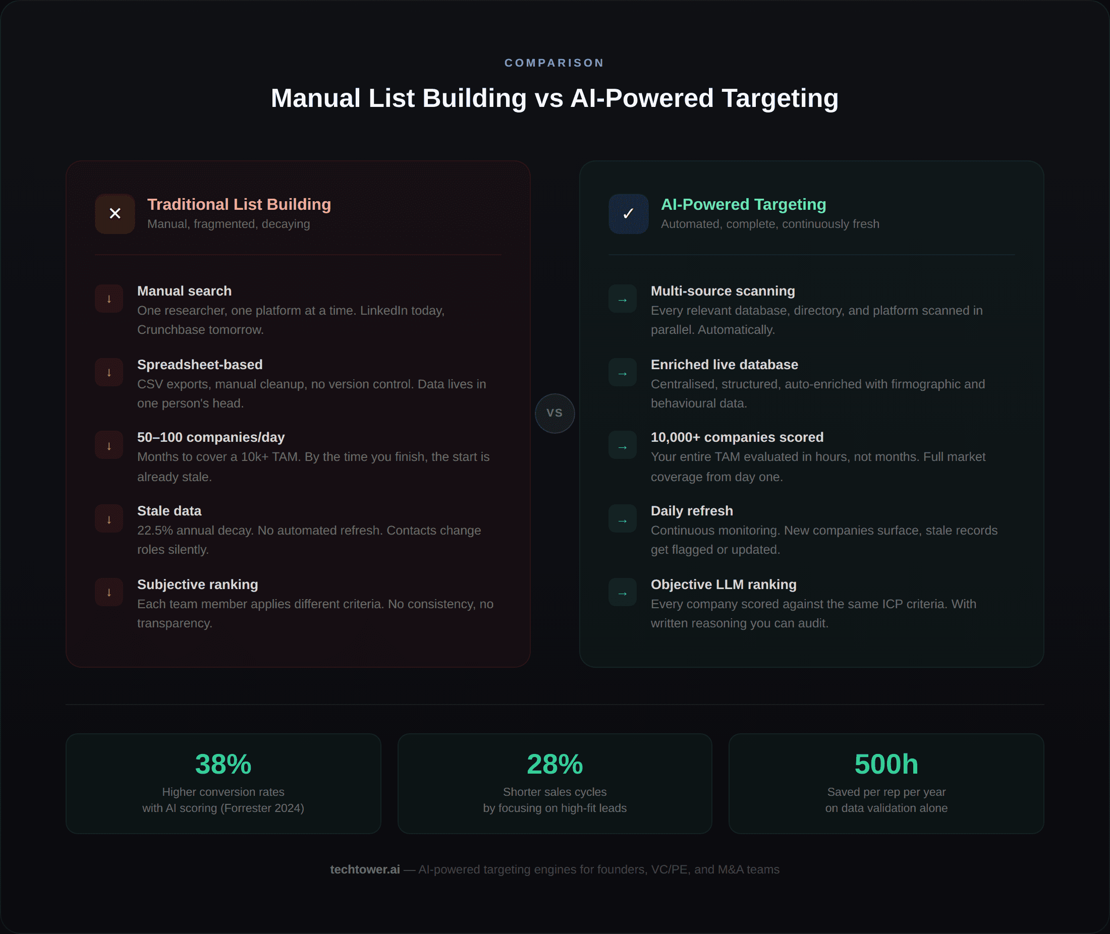 TechTower builds AI-powered targeting engines that scrape, enrich, score, and rank your full addressable market. You get a clean, prioritised pipeline of companies and contacts — updated automatically, scored against your specific criteria.